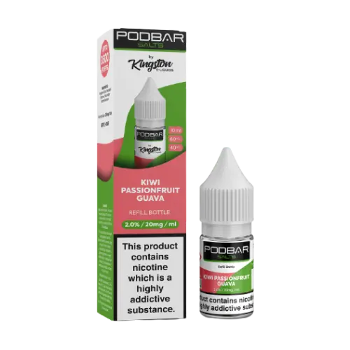Kiwi Passionfruit Guava Podbar salts are UK made by the famous Kingston E-liquid brand.