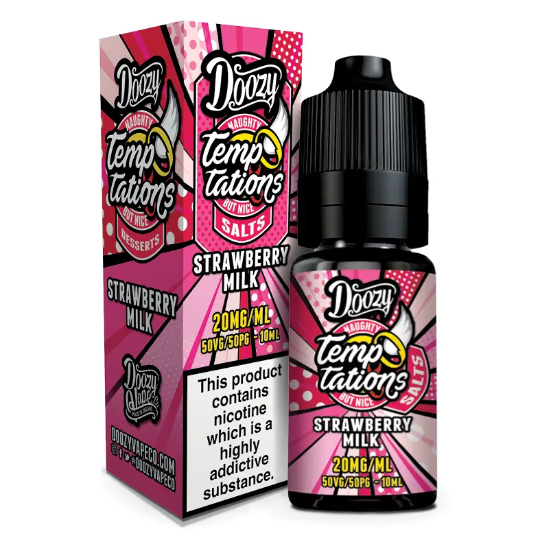 Strawberry Milk by Doozy Temptations Salts. Your favourite e-liquid flavour is now available as a 10ml nicotine salt. Enjoy the classic flavour in a new way without having the purchase disposable after disposable!