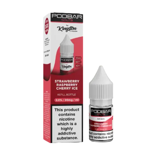 Strawberry Raspberry Cherry Ice Podbar salts are UK made by the famous Kingston E-liquid brand.
